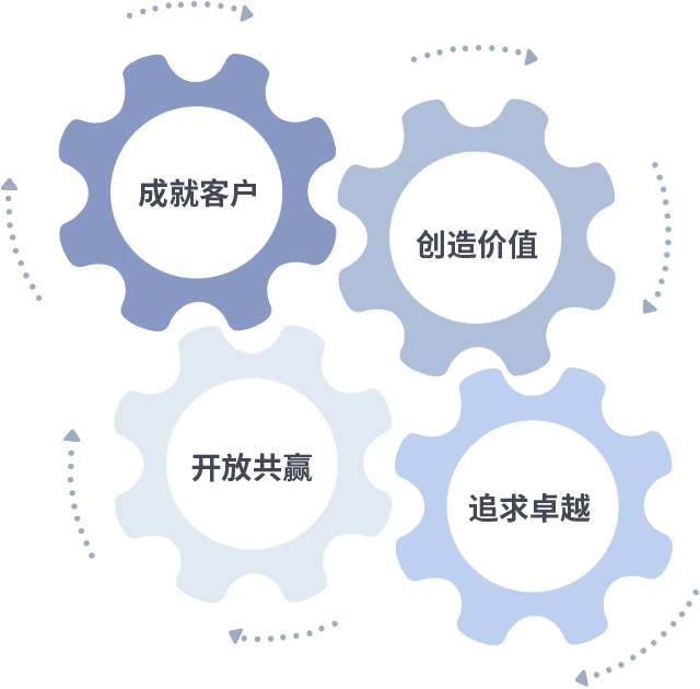 成就客户是一切决策的出发点,,,,创造价值是衡量所有工作的标准,,,追求卓越是我们做事做人的态度,,开放共赢是我们的格局也是最终的结果。。。。价值观的齿轮环环相扣,,推动着组织里的每个人不断向前。。